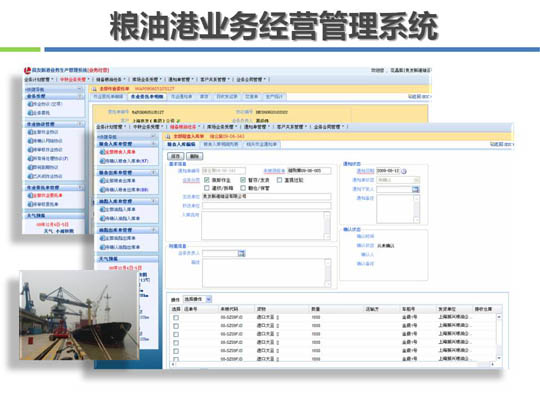针对粮油、件杂货港口的需求,以港口企业整体运作、经营、管理和决策的需求为基础,充分利用成熟先进的信息技术,建立满足企业高效管理和科学决策以及与业务伙伴间协同运转需要的综合营运系统。