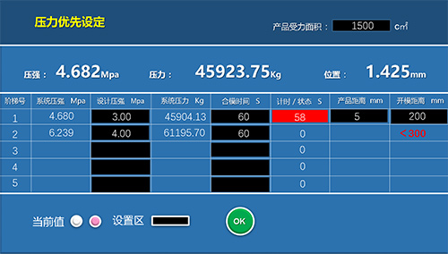 根据产品的面积配合压力、距离和时间,分段设定连续阶梯。可设定5个连续阶梯。实现全自动伺服控制。